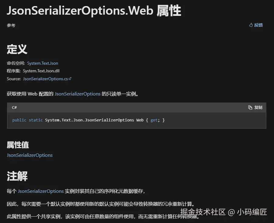 JsonSerializerOptions.Web 是一个新的单例实例,专为 Web 应用程序设计,提供了默认的 JSON 序列化选项。
