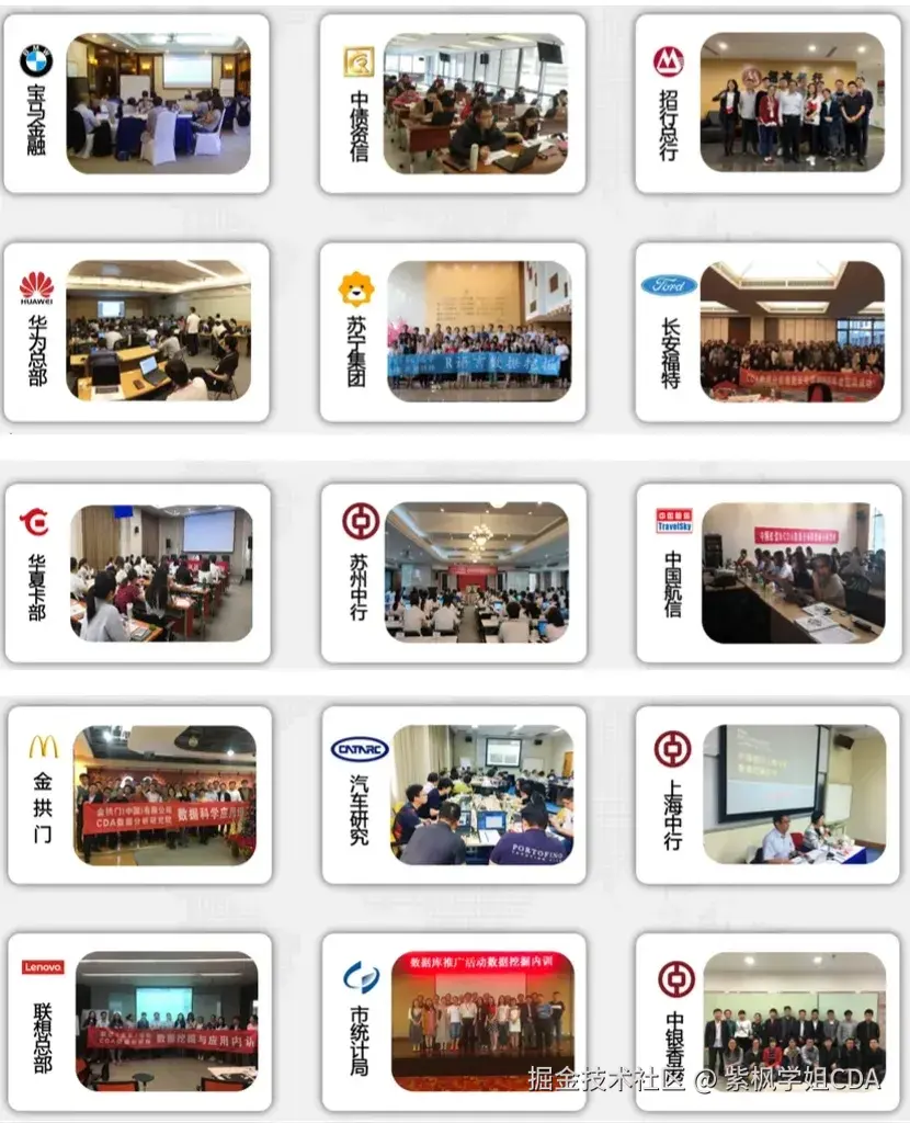 近年来CDA数据分析师已经为招行、华为、长安、苏宁等近百家机构提供了专业的内训服务。通过这些课程培训,企业员工能够掌握数据分析的技能,更好地理解和利用大数据,提升数据驱动的决策能力,支持企业的数字化转型和业务发展。