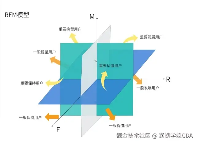 RFM 分析是美国数据库营销研究所提出的一种客户分析方法。该模型基于客户的最近购买时间(Recency)、购买频率(Frequency)、购买金额(Monetary)来评估客户的价值和分类。通过这三个维度的组合,将客户分为不同的群体,比如高价值客户、需要挽留的客户等,以便实施针对性的营销策略。