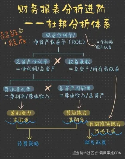 杜邦分析是一种综合财务分析方法,通过分解净资产收益率(ROE)为多个财务比率的乘积,以评估企业的盈利能力、资产运营效率和财务杠杆。杜邦分析的基本思想是将ROE分解为销售净利润率、资产周转率和权益乘数,从而深入分析企业的经营业绩。