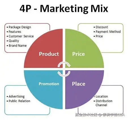 4P营销模型由4个要素构成,即产品(Product)、价格(Price)、渠道(Place)、宣传(Promotion)。