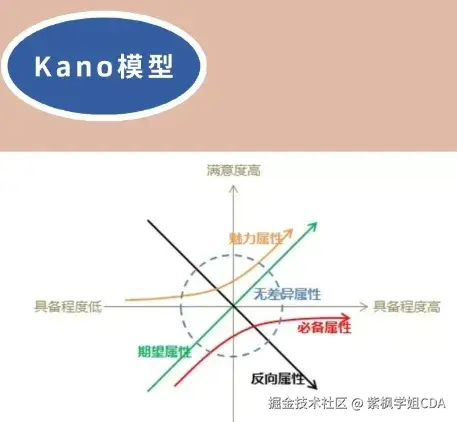 KANO模型是一种需求分析和优先级排序工具,将商品属性分为必备性需求、期望型需求、兴奋性需求、无差异需求四类。通过理解不同类型的需求对用户满意度的影响,确定产品特性的优先级。