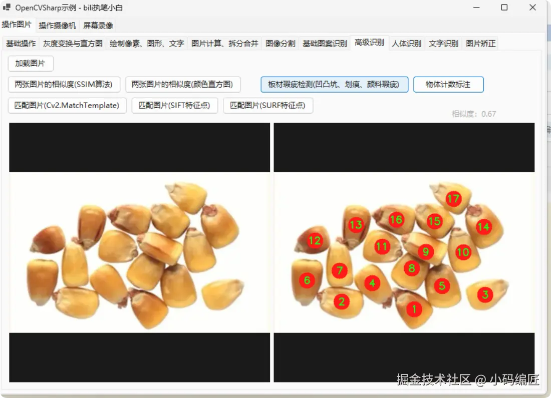 基于 C# 和 OpenCvSharp 的物体计数与标注系统成功实现了对玉米粒等小型物体的高效、精准计数和标注。相比传统的手动方式,该系统具有以下显著优势:
