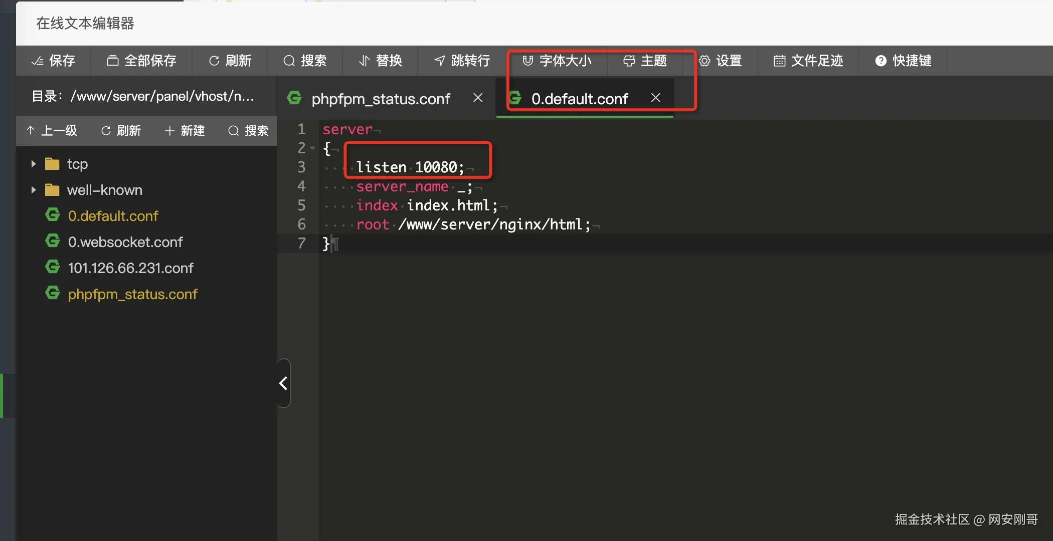 在文件进入/www/server/panel/vhost/nginx/,分别编辑0.default.conf和phpfpm_status.conf文件,将默认监听端口修改为其他非占用端口,比如10080,最后保存退出