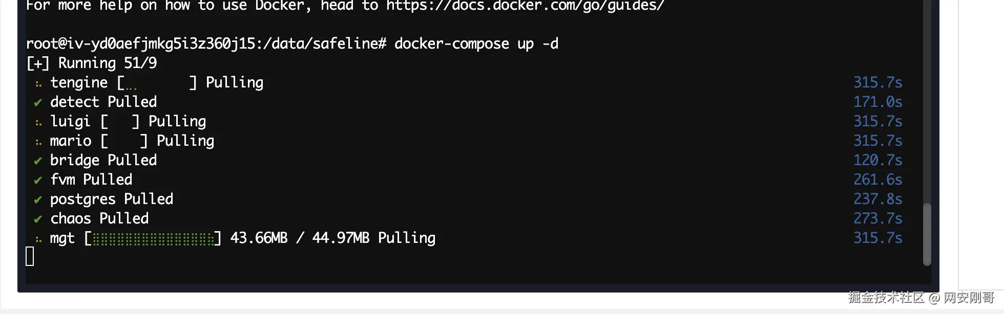 在雷池的安装目录下(/date/safeline)使用docker-compose up -d启动一下