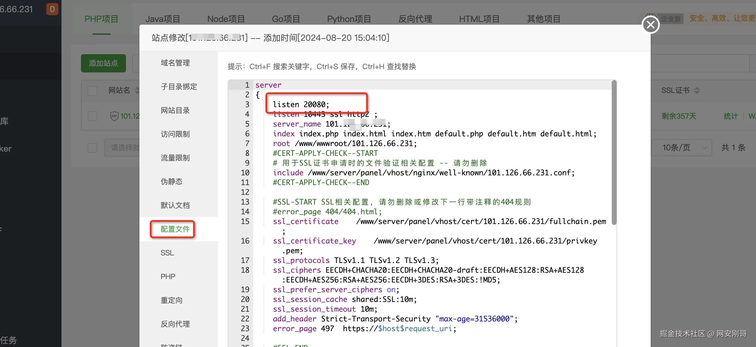 在“网站”中单击“Nginx1.X.X”打开Nginx管理窗口切换到“配置修改”,下滑配置文件内容到底部,找到include指令,找到Nginx引入的配置文件路径,例 如/www/server/panel/vhost/nginx/