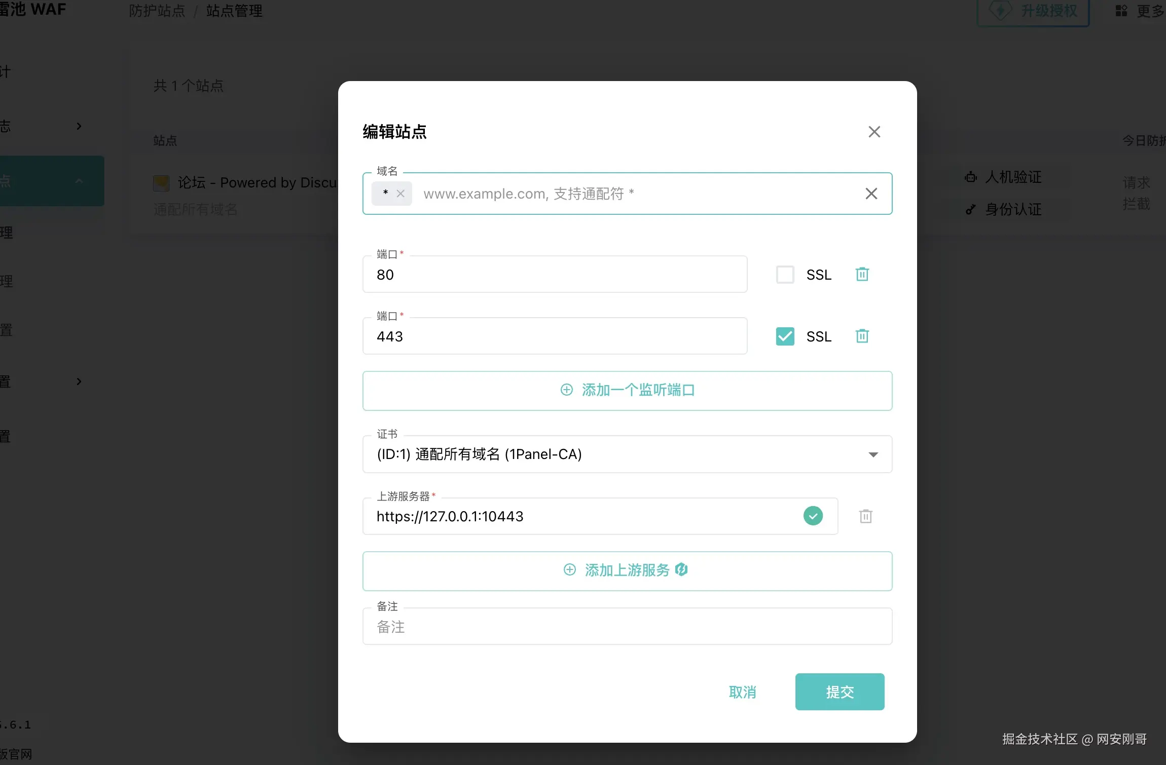 这时候 需要配置雷池站点的时候上游服务器就是