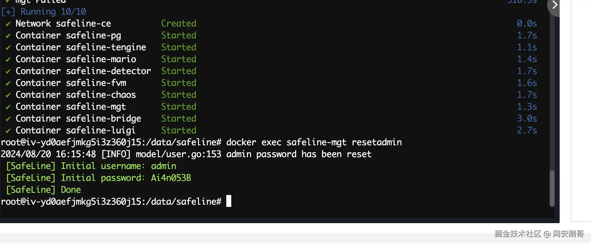 启动雷池成功了,因为之前安装脚本执行报错了,没有初始化账户密码,需要手动执行重置一下命令