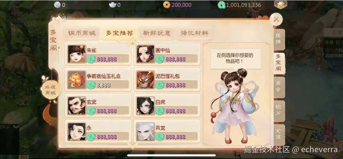 我自己开服游戏暂时不开放后台,这次我是把特别厉害的宝宝和仙玉宝箱都放到了多宝推荐商城里,这样大家可以无限获取仙玉和宝宝,就不用开后台了。