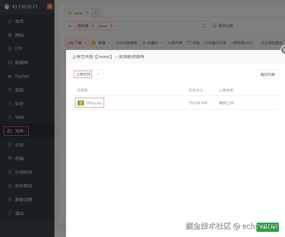 拿到源码后,将dhxy.zip压缩文件通过宝塔上传到根目录,由于最新的宝塔禁止直接上传到根目录,可以先上传到任一目录下,在剪切粘贴到根目录。