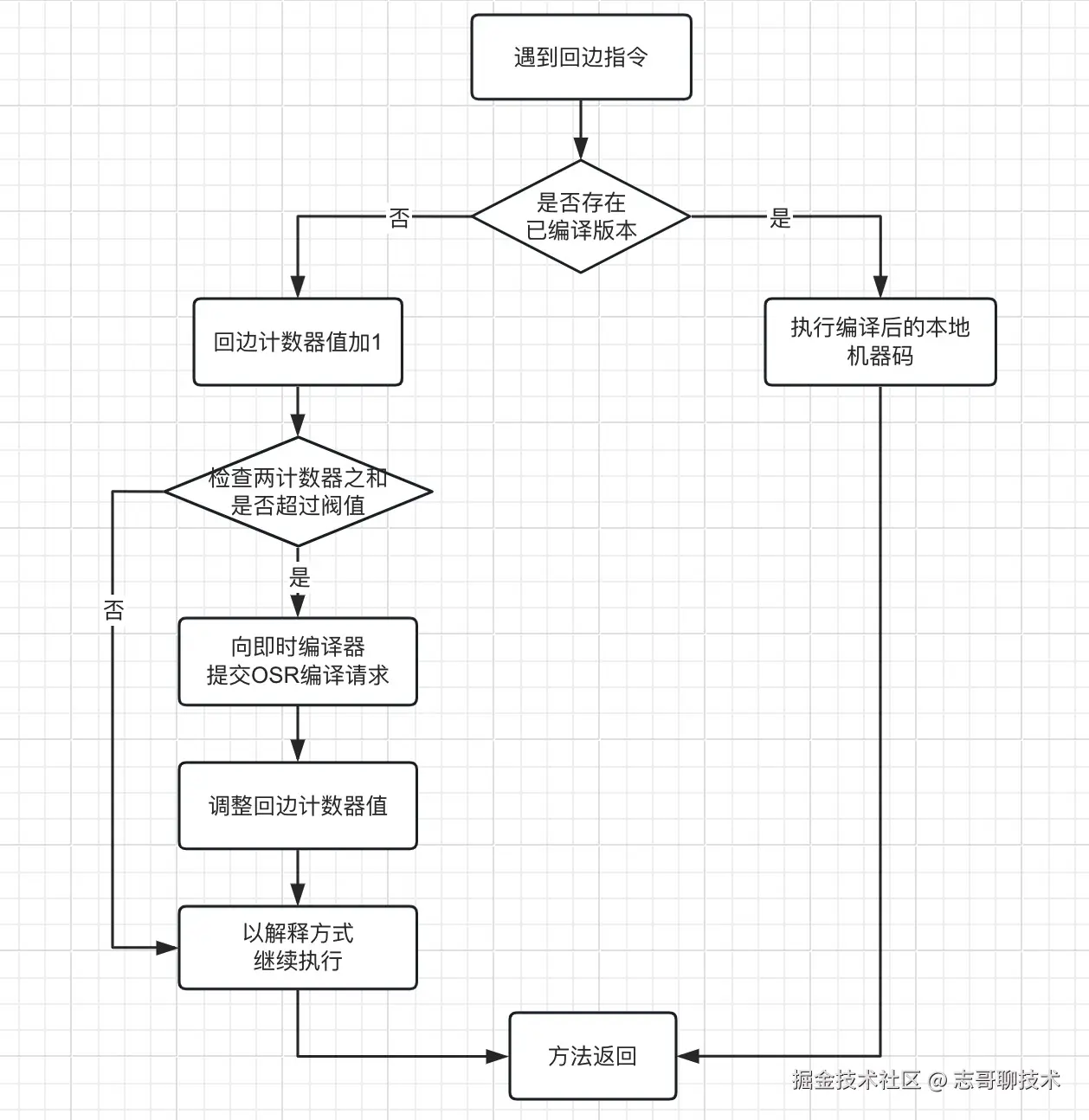 当解释器遇到一条回边指令时,会先查找需要执行的代码片段中是否有已经编译的版本,如果有,会优先执行已编译好的代码;如果没有,就会把回边计数器的值加 1,然后判断方法调用计数器和回边计数器值之和是否超过回边计数器的阈值,如果超过,就会向即时编译器提交一个 OSR 编译请求,并且把回边计数器的值降低一些,以便继续在解释器中执行循环。