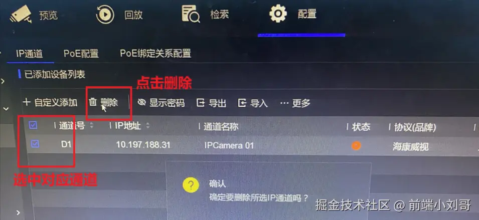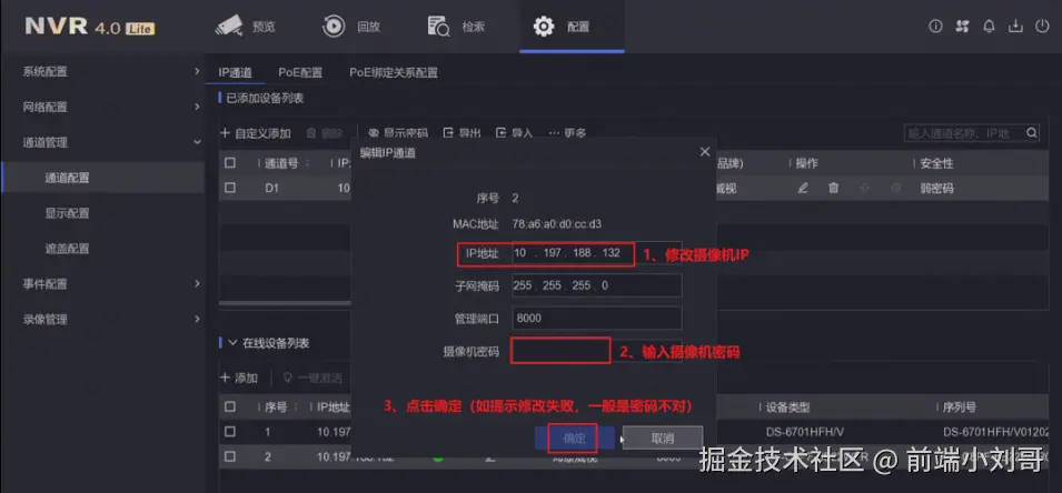 需要注意的是,如果摄像机在通道列表内,状态是红X异常,需要先删除这个通道设备,然后在“在线设备列表”页面去修改摄像机的IP地址等参数。如果忘记摄像机密码,可以通过海康公众号“自助重置密码助手”重设相机的管理密码。