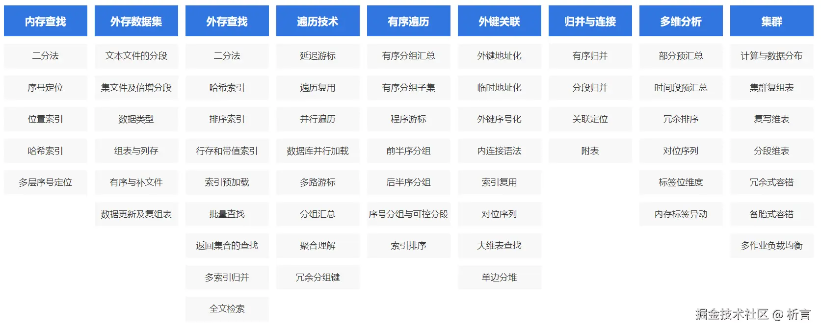 在高性能文件存储的基础上,esProc 还设计了诸多高性能算法(要知道有些算法需要存储的配合才能应用),其中有序游标、遍历复用、外键指针、单边分堆、倍增分段并行等都是 esProc 的独创发明。