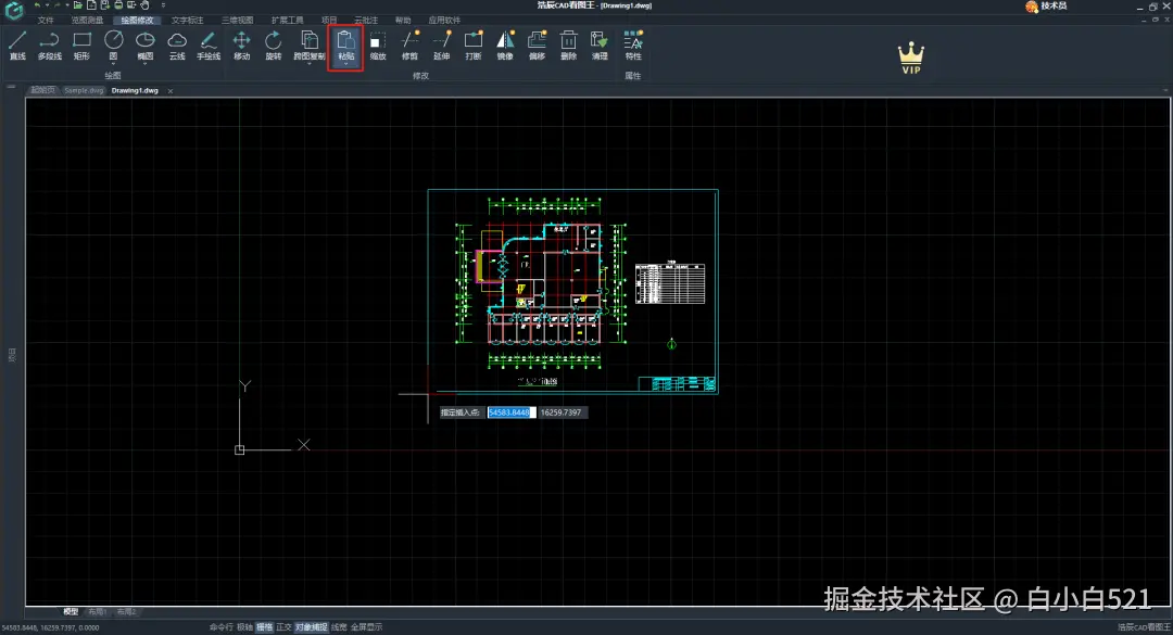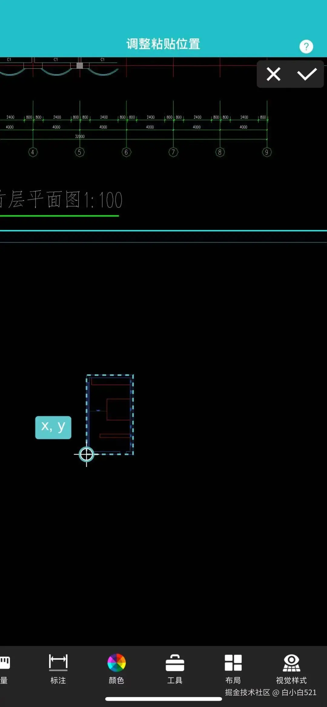 返回首页,打开要粘贴的图纸,点击 “跨图粘贴”功能,在图纸上找到合适的位置,可拖动点标记调整要粘贴的位置,再点击右上角“✔”按钮完成粘贴动作。