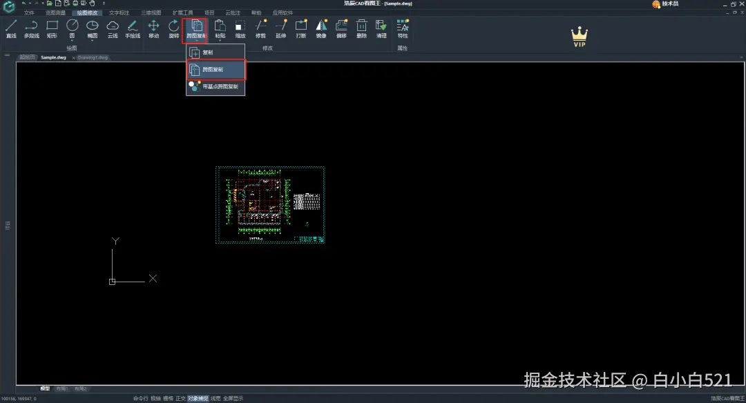操作流程:打开图纸点击菜单栏,点击工具箱内 “跨图复制” 功能,框选出图纸中需要复制的对象,点击右上角“✔”按钮,完成复制动作;