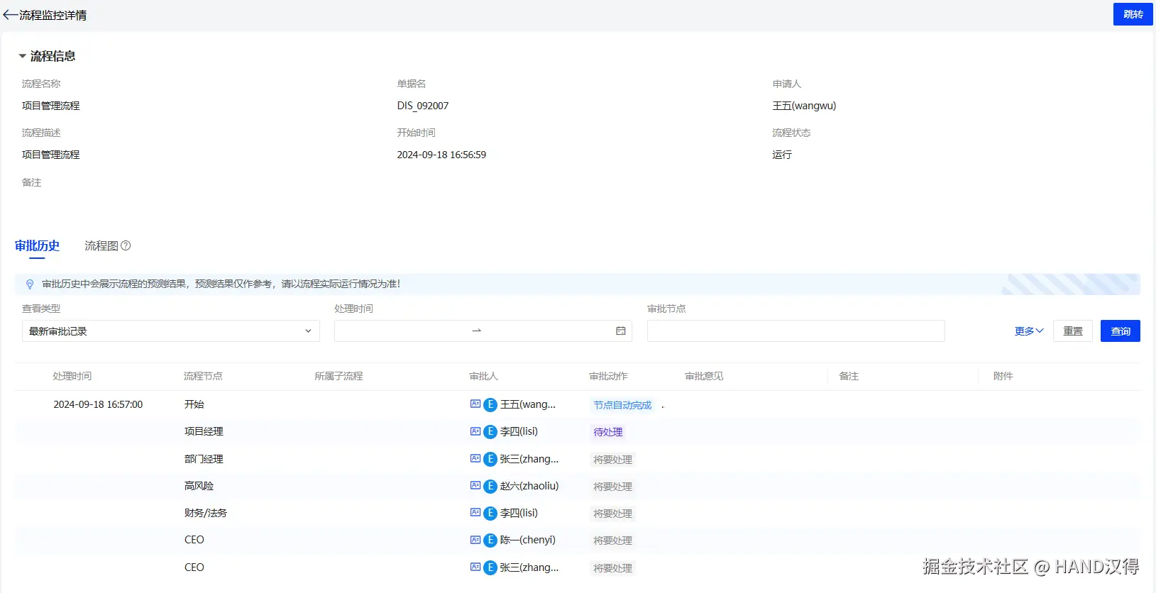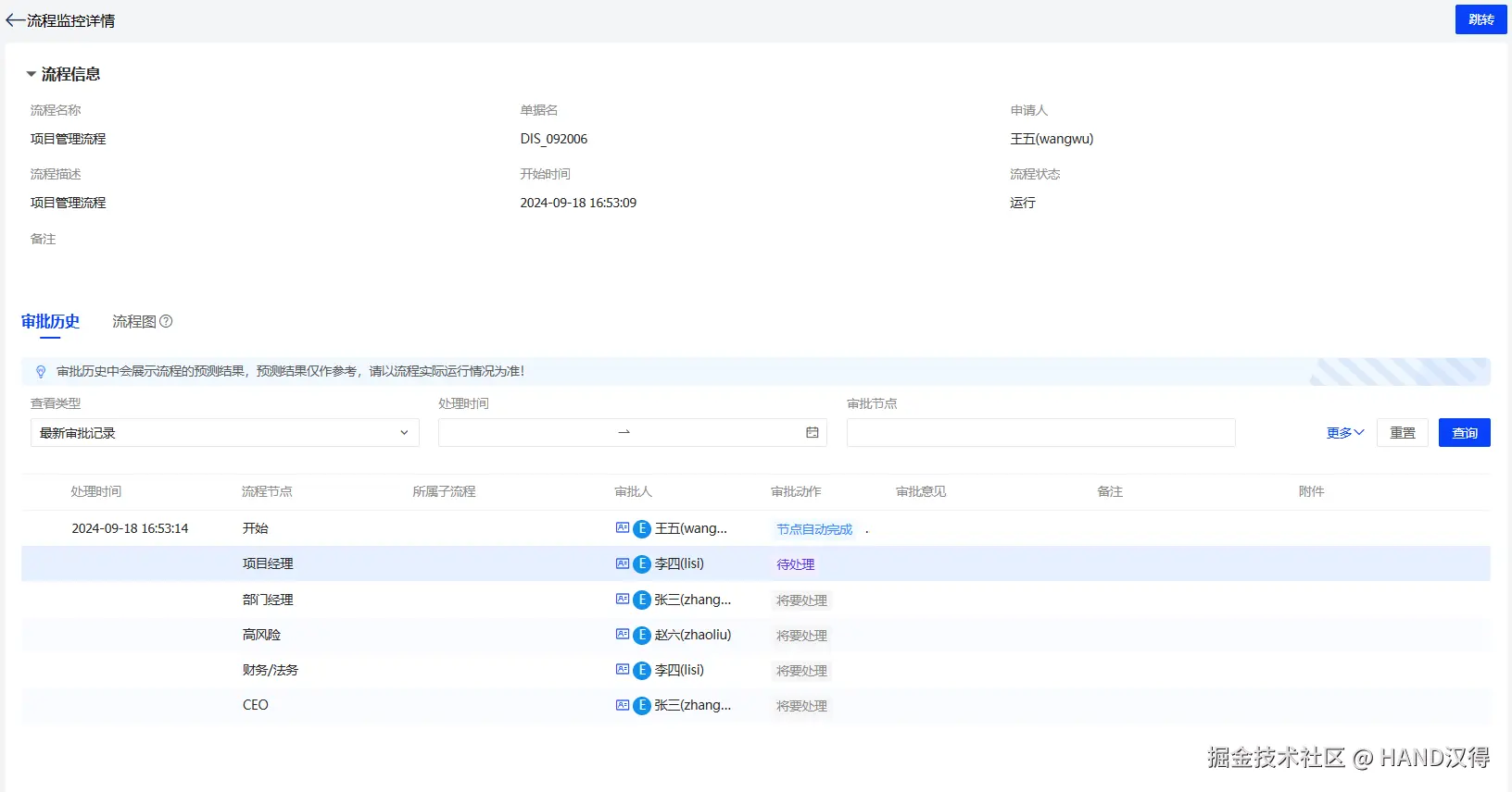 根据同样的条件启动流程后,可查看到后续的审批人已经更新。