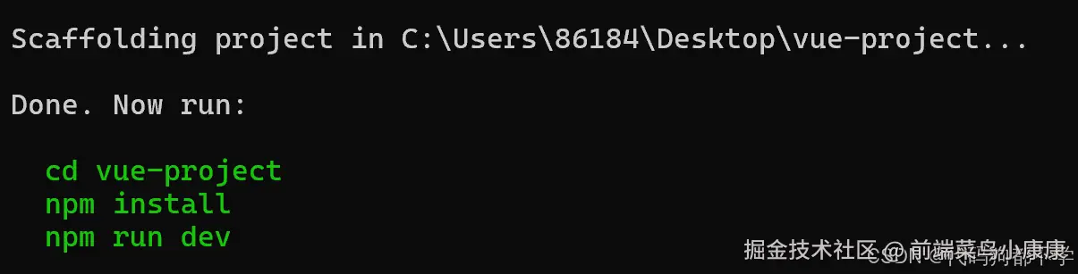 - 然后根据提示一直按回车就可以了(ps:这里的相关配置我就不过多介绍了,这期主要讲vue+electron的配置依赖),出现以下提示就证明安装成功了。