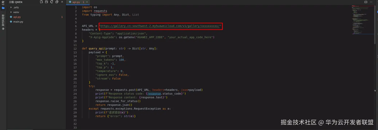 用刚刚获取的API调用地址去替换代码下图的红框括号“ ”里面的内容。