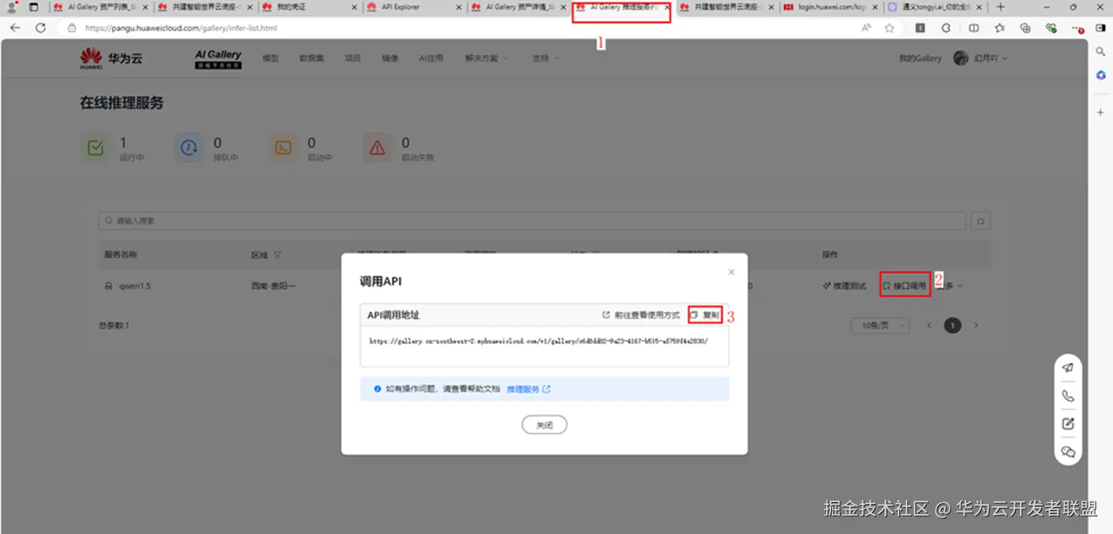 在以下链接获取自己之前部署模型的API调用地址: AI Gallery 推理服务列表 _ 华为云 (huaweicloud.com)