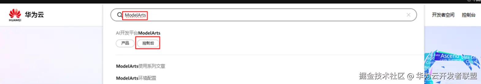 1. 打开华为云官网(www.huaweicloud.com/),在搜索框输入“ModelArts”,选择“AI开发平台ModelArts”的控制台,进入到AI开发平台ModelArts 的控制台页面。