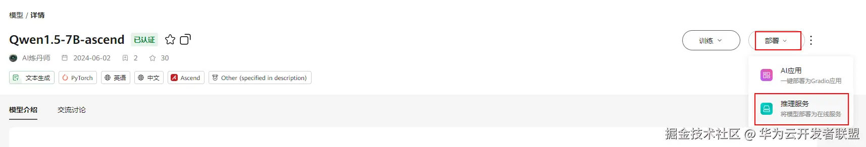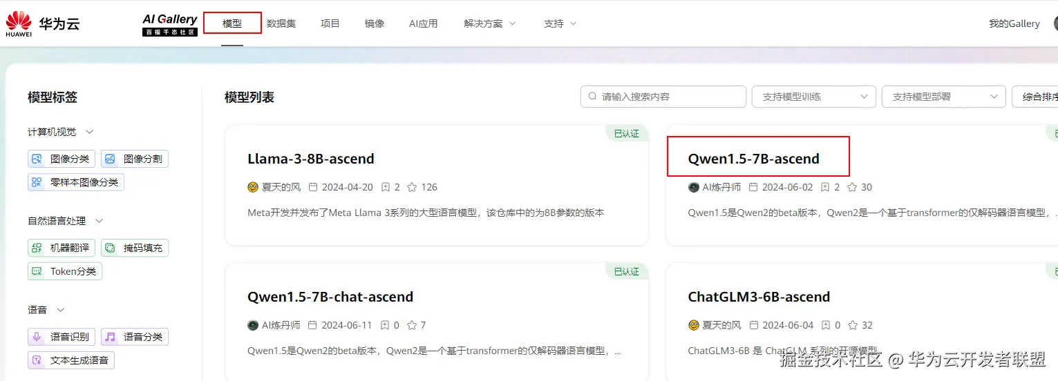 3. 点击上方的“模型”,打开模型列表页面,在其中选取自己需要的模型,本次实验选择的是Qwen1.5-7B-ascend的模型。 Qwen1.5是一个语言模型系列,包括不同模型大小的解码器语言模型。对于每种规模,都发布了基本语言模型