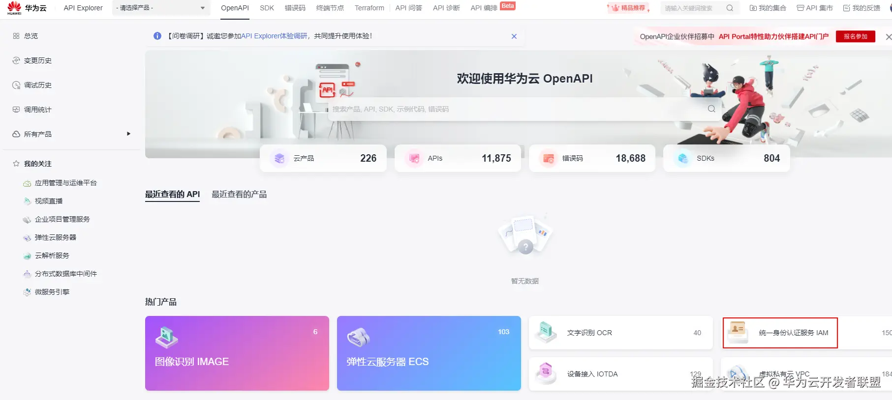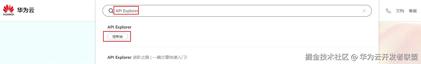 1. 打开华为云官网(www.huaweicloud.com/),在搜索框输入“API Explorer”,选择“API Explorer”的控制台,进入到API Explorer页面。