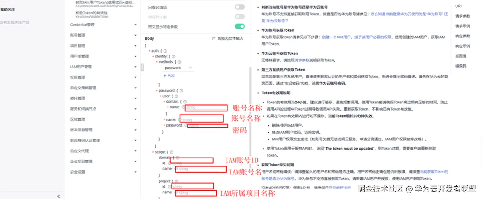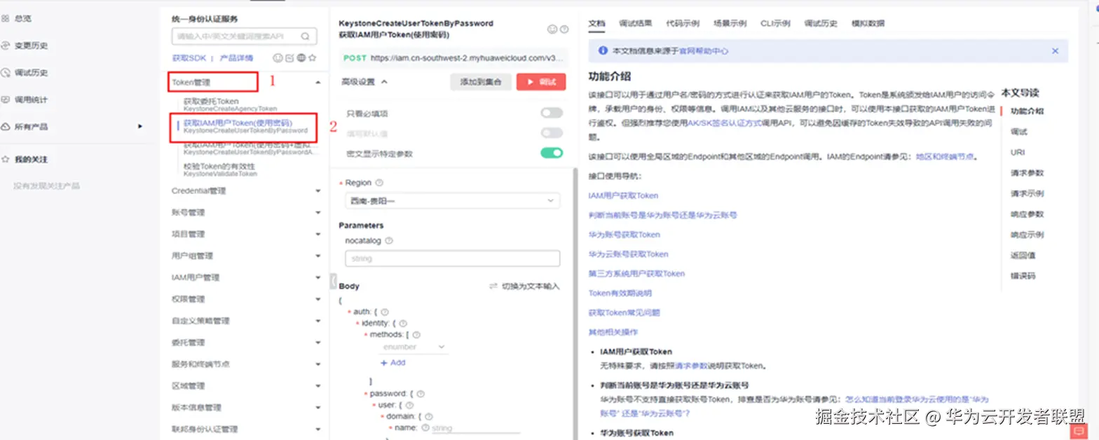 3. 在统一认证服务的API列表中,单击“Token管理”->“获取IAM用户Token(使用密码)”,在案例中需要使用此接口通过用户名/密码的方式进行认证来获取Token。