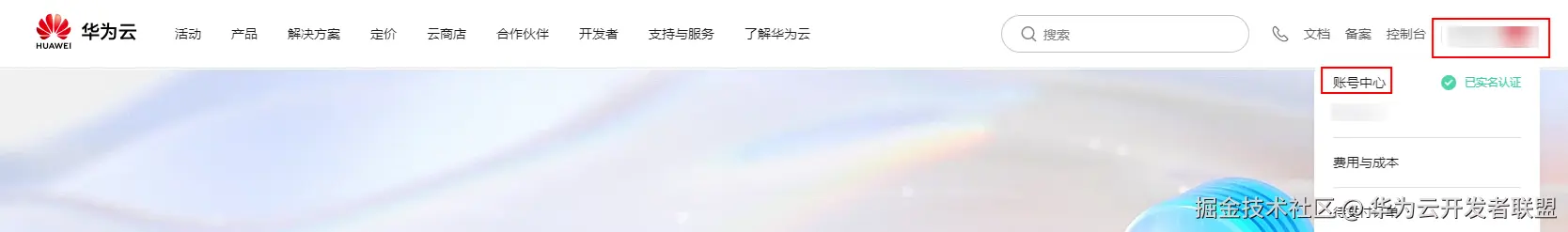 4. 使用接口需要先获取账号的一些信息,单击华为云首页右上方的用户名,选择“账号中心”。
