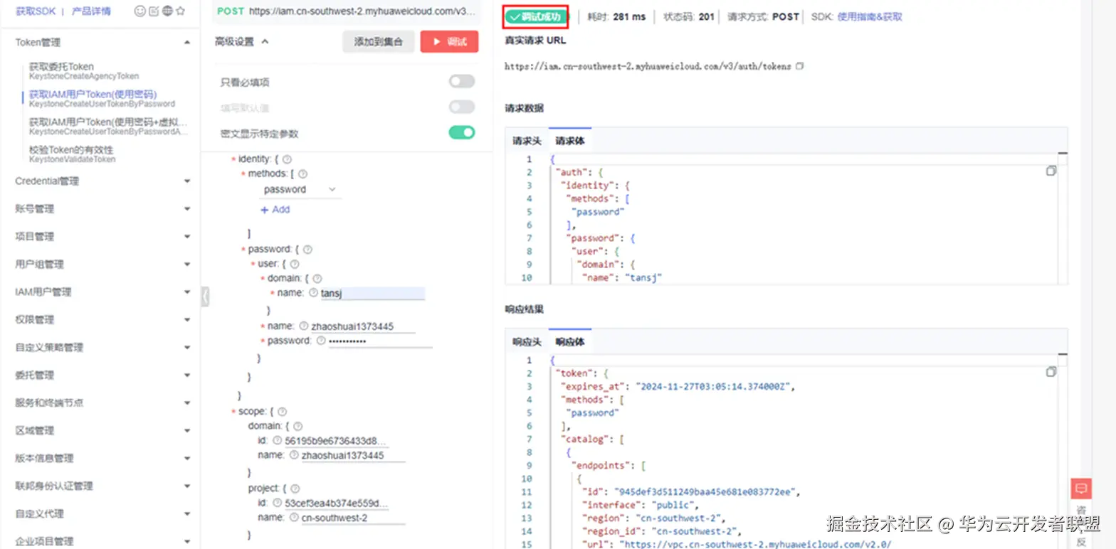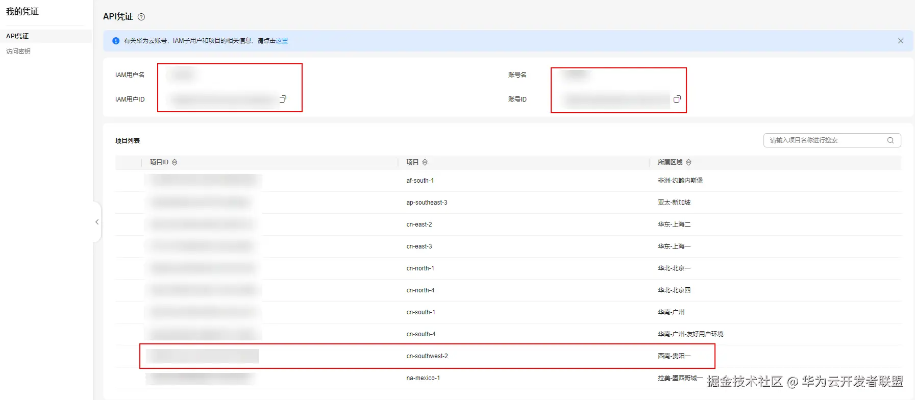 将凭证页面中的下列信息记录下来,用于进行接口调用时使用。其中的项目ID我们使用的是西南-贵阳一区域,因为模型部署在贵阳一区域。