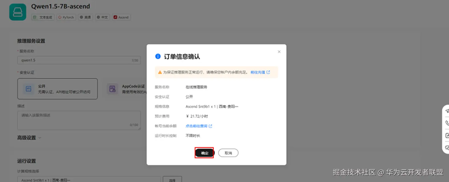 服务名称:qwen1.5安全认证:公开运行设置-计算规格选择:贵阳一,设置完成后,单击“启动部署”,确认订单信息后开始部署。