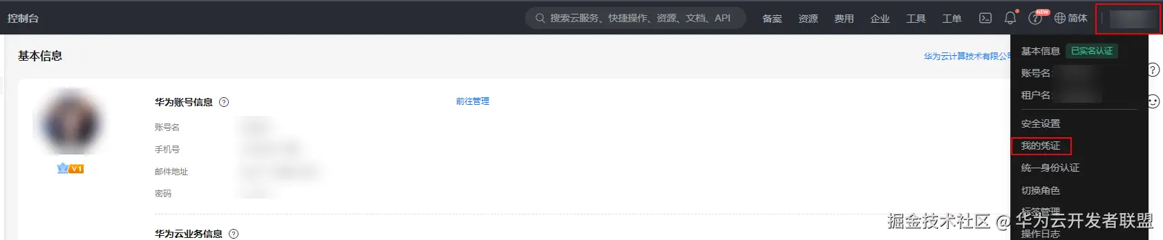 进入到账号中心控制台页面,单击右上角的用户名,在打开的下拉菜单中选择“我的凭证”。