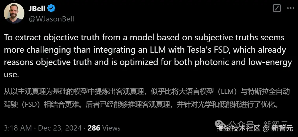 有人说,从基于主观事实的模型中提取客观事实,看起来比 LLM 跟特斯拉 FSD 相结合更具挑战性,因为后者已经推理出了客观事实。