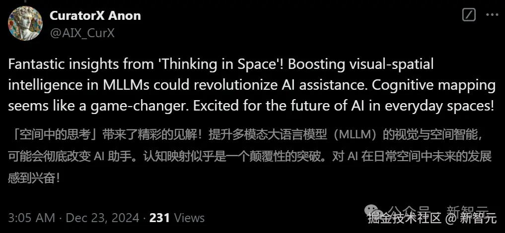 网友表示,这项关于「空间思维」的见解实在太精彩了。提高 MLLM 的视觉空间智能,可能会彻底改变 AI 助手。AI 在日常空间中的未来,实在令人兴奋。