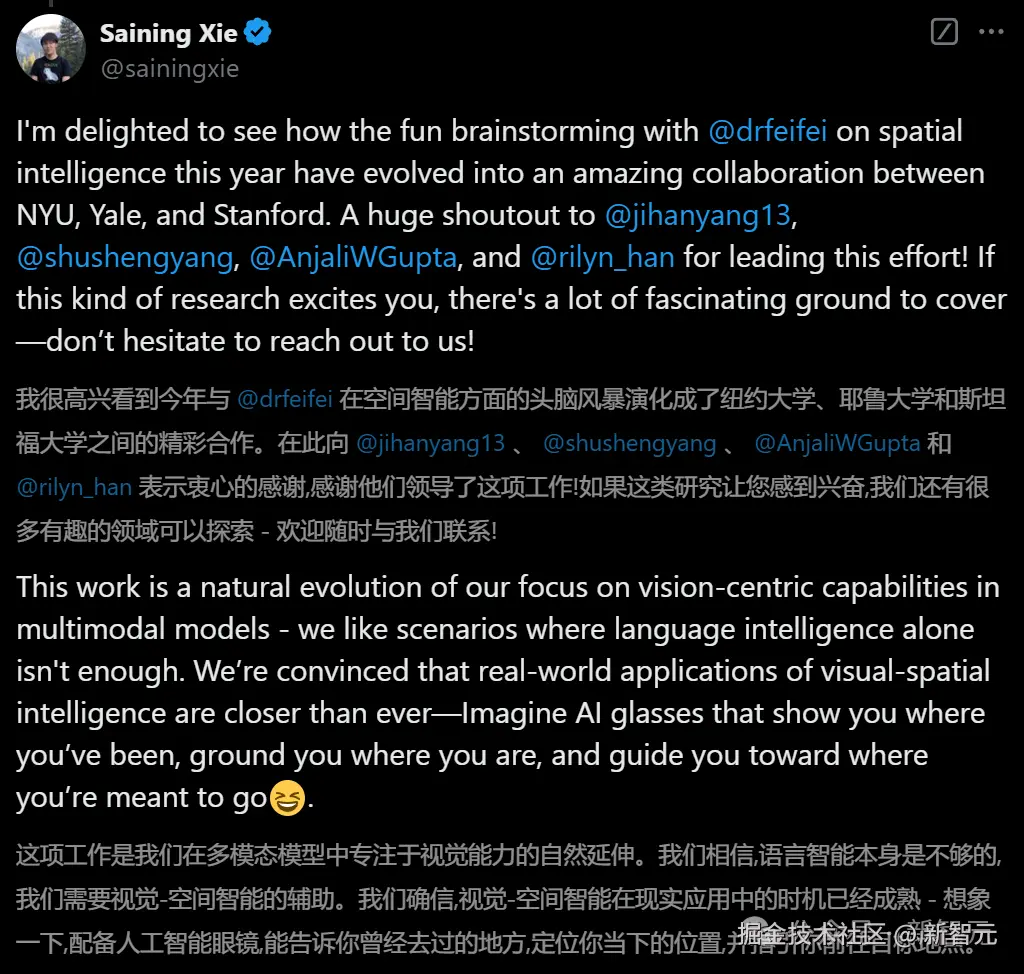 谢赛宁也表示,大家和李飞飞进行的关于空间智能的有趣头脑风暴,已经发展成了 NYU、耶鲁和斯坦福之间的惊人合作。
