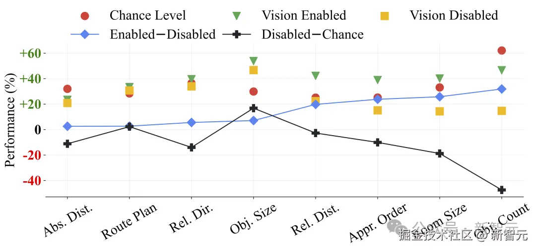 在「启用 - 禁用」模式下的一致改进以及「禁用 - 随机」模式下的普遍退化,凸显了视频输入对 VSI-Bench 的重要性,因为禁用视觉模式的模型表现低于随机水平。