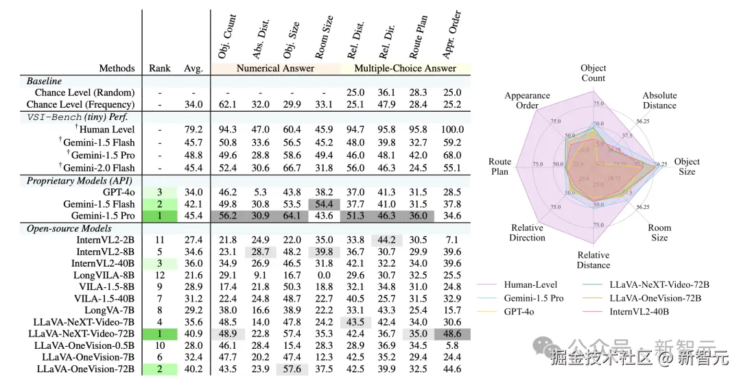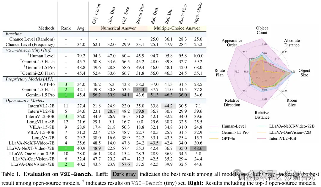 表 1 VSI-Bench 的评估结果。左:深灰色表示所有模型中最佳结果,浅灰色表示开源模型中的最佳结果;右:人类、两个闭源模型以及 Top 3 开源模型的结果