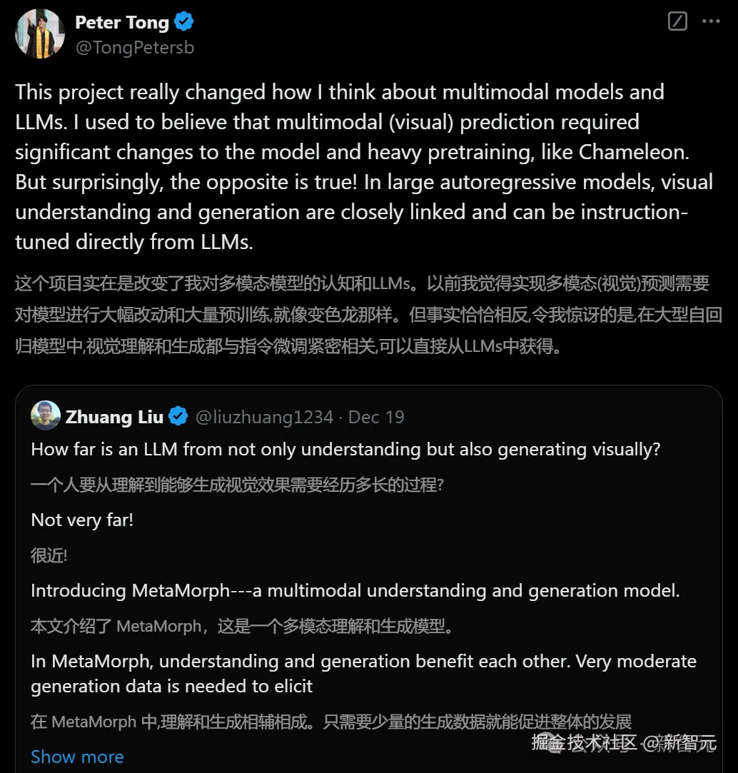 更巧的是,就在不久前,谢赛宁还和 LeCun 等人合作完成了一项 MetaMorph 的工作。他们发现:LLM 离理解和生成视觉内容已经不远了。