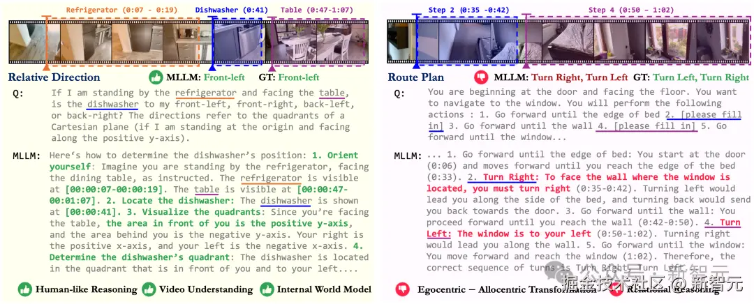 在换位思考、第一到客观视角的转变上,它们通常表现得极其困难,并且在更长时间的推理过程中,容易失去对物体的追踪。