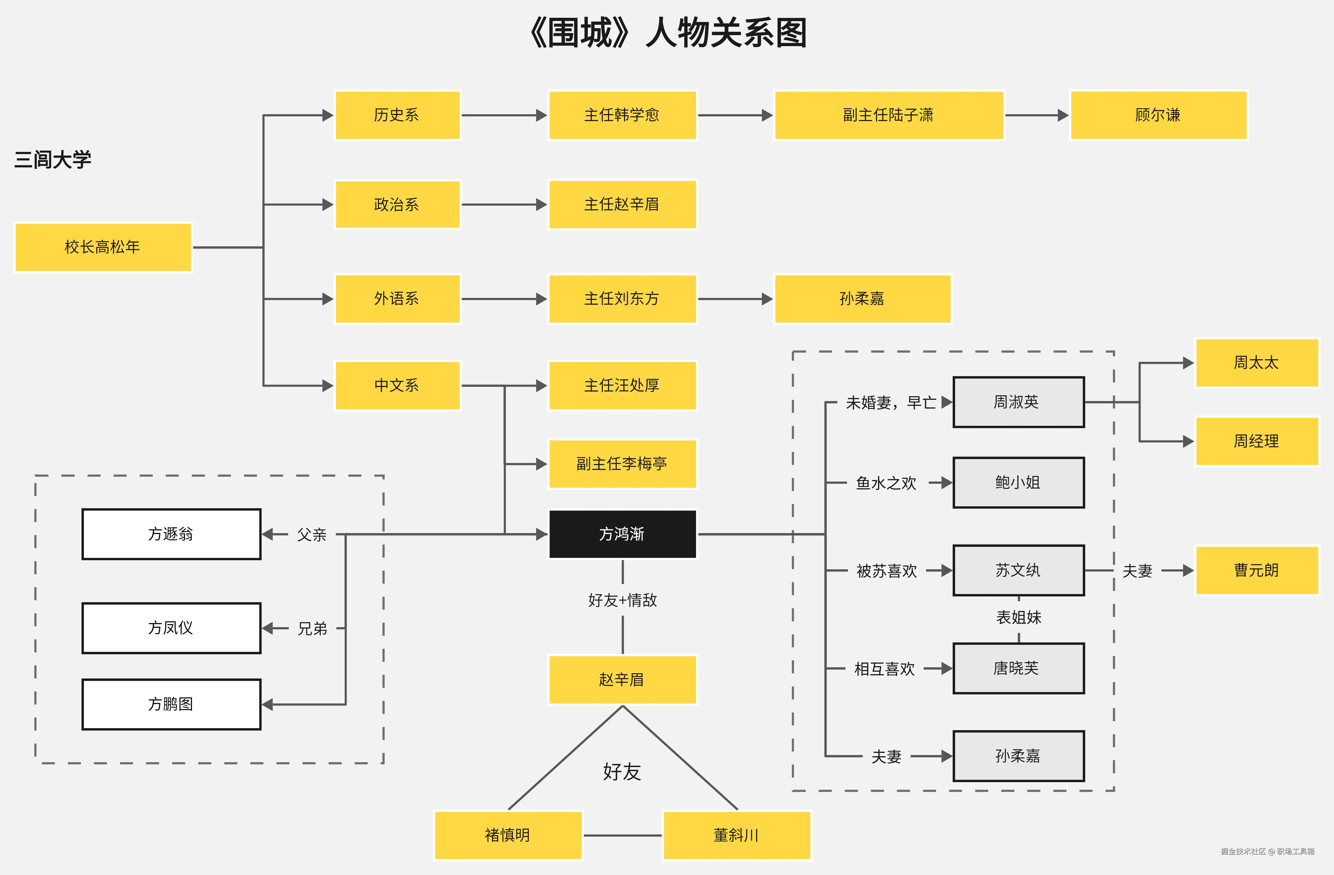 《围城》人物关系图模板是对钱钟书经典小说中人物关系的深度解析。这张图谱揭示了主人公与周围人物之间的情感纠葛和社会关系,帮助读者理解小说中的人物如何在20世纪30年代的中国社会中挣扎与追求。