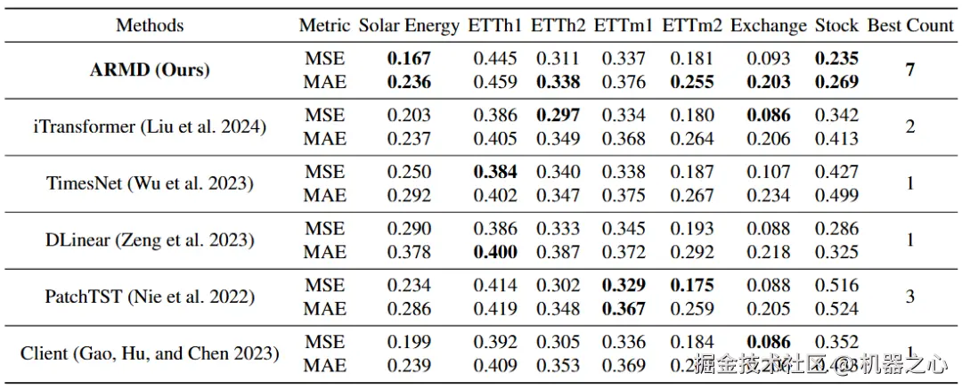 表二:时间序列预测实验之与端对端时间序列预测基准模型的结果比较。最佳结果以粗体突出显示。“最佳次数” 列表明模型取得最佳结果的次数。