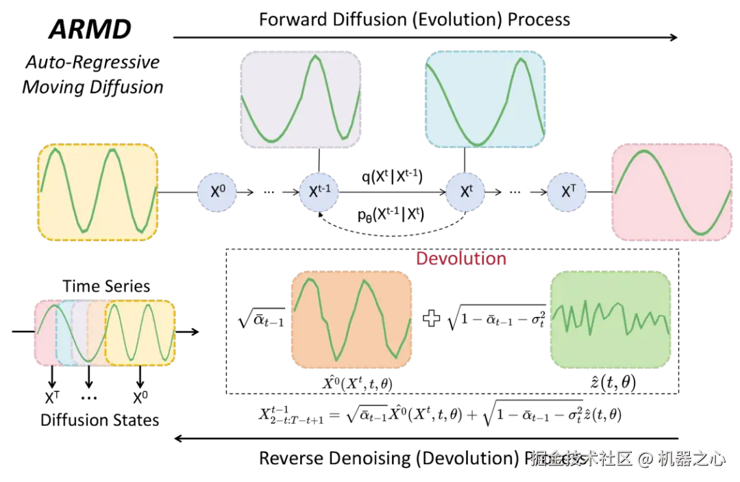 在 ARMD 中,时间序列的演进被概念化为一个扩散过程,时间序列的每一步都可以看成是扩散模型的一个状态,如图二所示。未来序列(下标表示在序列中的位置,上标表示在扩散模型中的状态)作为前向扩散(演进)过程的初始状态,而历史序列