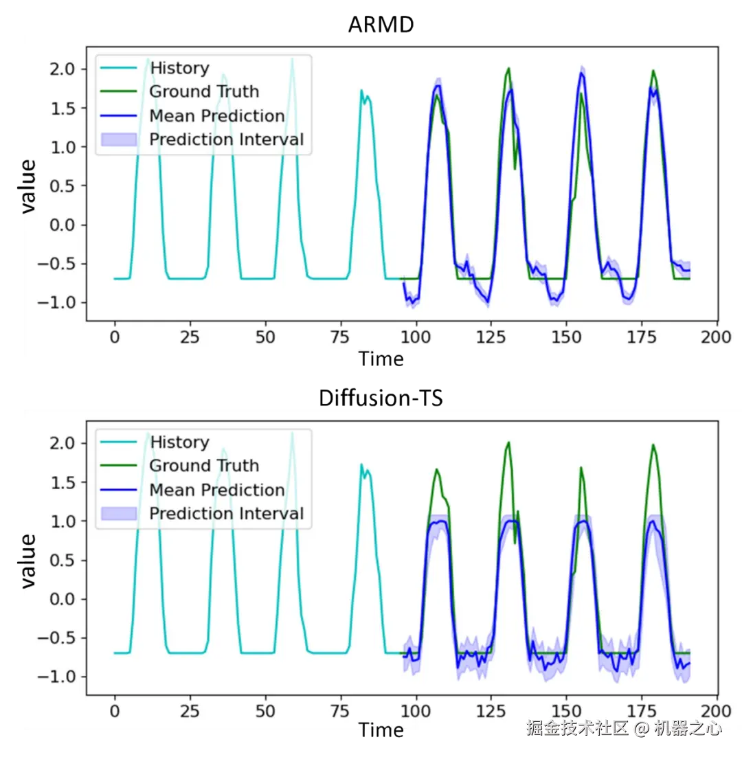 图三: ARMD 和 Diffusion-TS 在给定相同历史序列的情况下,分别做出的 10 次不同预测的分布情况。ARMD 实现了更稳定且准确的预测。