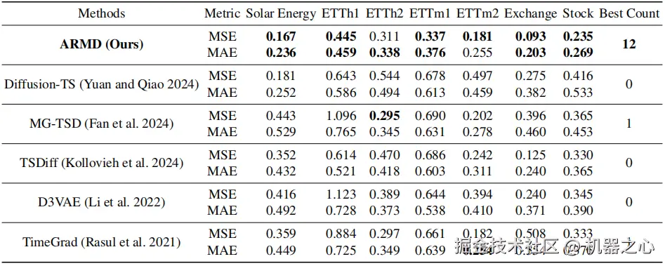 表一:时间序列预测实验之与基于扩散的时间序列预测基准模型的结果比较。最佳结果以粗体突出显示。“最佳次数” 列表明模型取得最佳结果的次数。