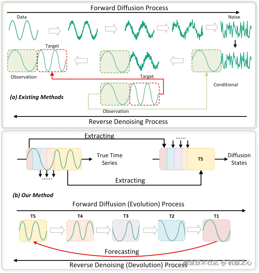 图一:已有的基于噪声的时序扩散方法和 ARMD 的时序扩散方法对比。