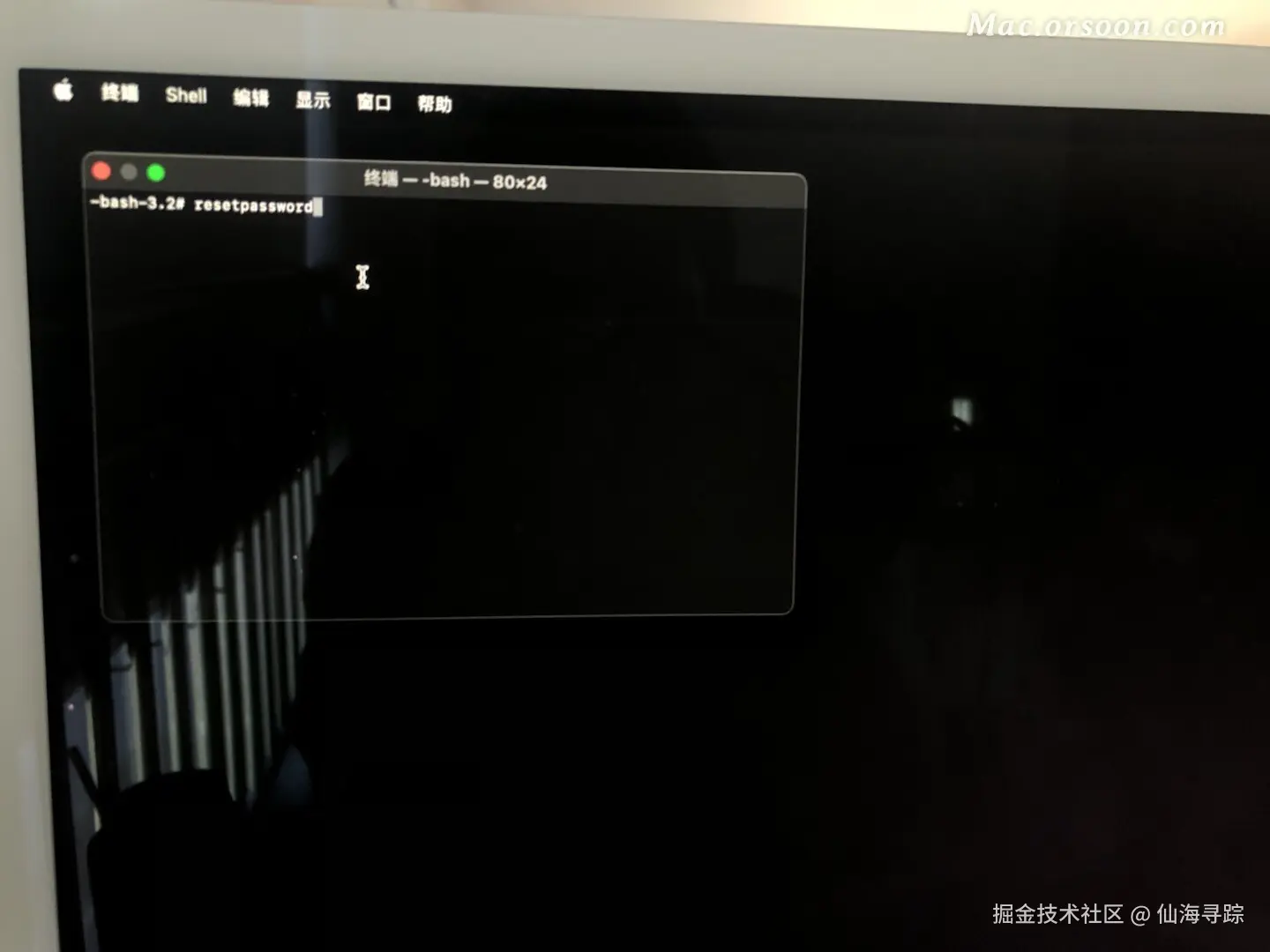 3、在【终端】内输入命令 【resetpassword】命令,然后点击Return回车键,如图: