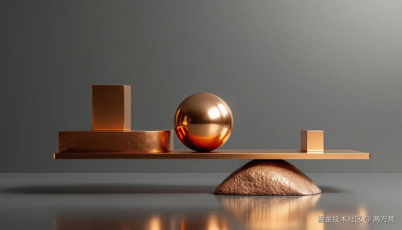 Prompt: Polished bronze forms create a mesmerizing study in equilibrium. A gleaming copper sphere rests perfectly balanced against geometric blocks on a sleek metallic beam. The warm, lustrous surfaces catch and reflect light dramatically against a serene gray backdrop, while subtle textures add depth and intrigue. This sophisticated arrangement demonstrates both strength and delicacy, embodying harmony through its precise geometric composition.
