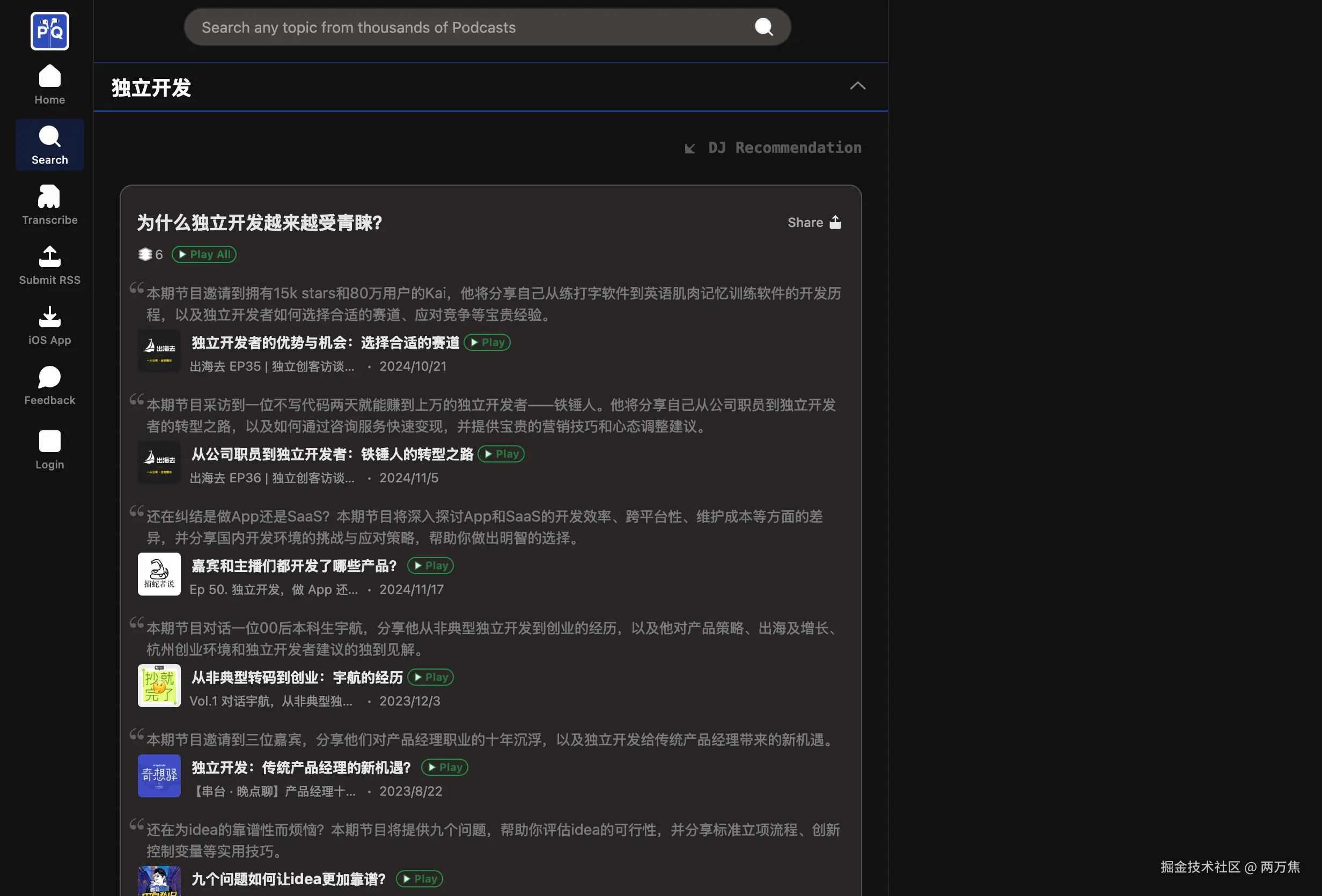 - PodQuest: 一个播客搜索引擎,中文搜索的效果支持的很好