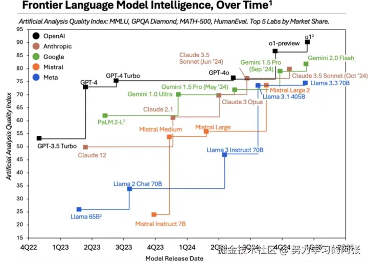来自 Artificial Analysis 的调研数据清晰显示,Anthropic 和 Google 等厂商陆续开发出性能接近 GPT-4、OpenAI o1 等新模型。