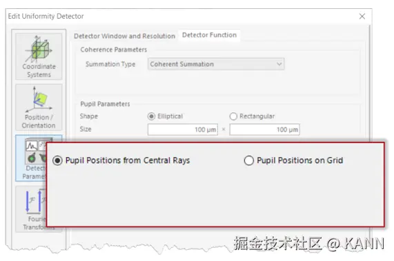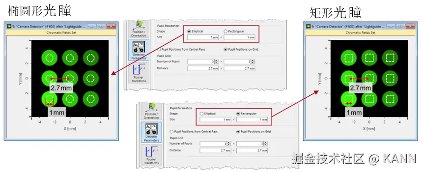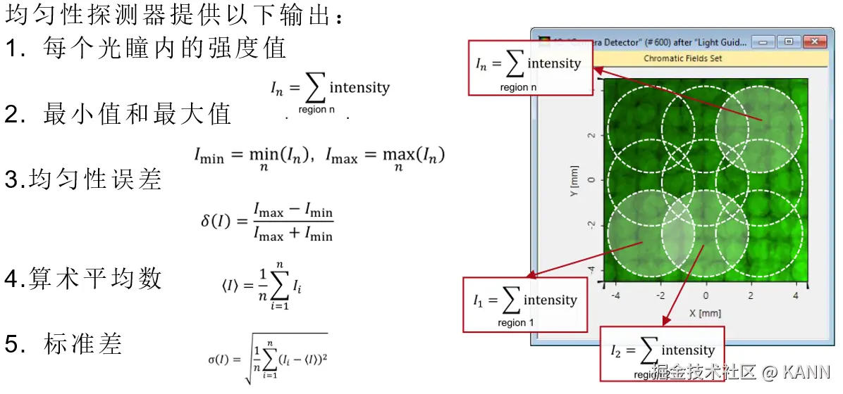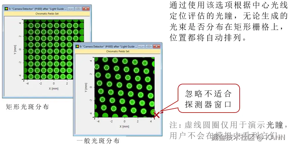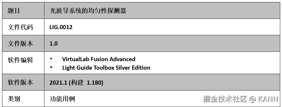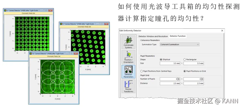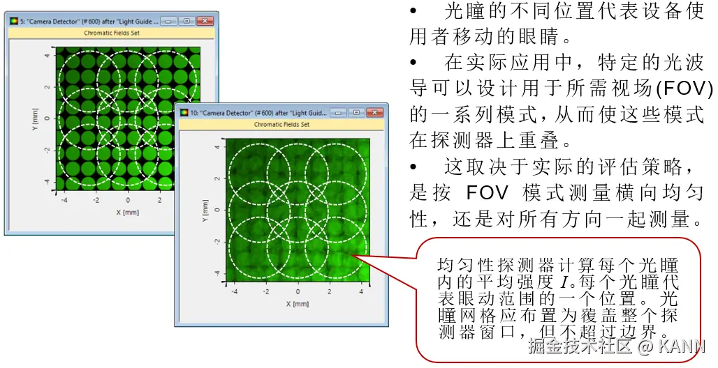 摘要 在评估AR/MR(增强或混合现实)设备中光波导系统的性能时,眼动范围内光线分布的横向均匀性是最关键的参数之一。为了在设计过程中测量和优化横向均匀性,VirtualLab Fusion提供了均匀性探测器,可以进行所需的研究。在本文件中,我们将演示可用的选项以及如何操作均匀性探测器。 案例演示 均匀性探测器 探测器功能:相干参数 如果存在多个相干模式,则重叠的模可以相干叠加、非相干叠加或部分相干叠加。 对于部分相干叠加,可以通过输入相干时间(或从相干时间和长度计算器复制)来指定相干程度。 **探测器功能:光瞳参数 ** 均匀性探测器评估在配置的局部区域(称为光瞳)的照射强度。 每个光瞳由其大小(dx×dy)和形状定义,可以设置为椭圆形或矩形。 椭圆形光瞳: 矩形光瞳: 探测器功能:光瞳位置 一旦设置了所考虑的光瞳的大小和形状,则必须配置探测器窗口中的光瞳数量和位置。 第一个选项是,根据每个单独足迹的中心光线自动确定光瞳的位置。 探测器只会将光瞳放置在所有光瞳都在探测器窗口内的位置。所有其他部分足迹将被忽略。 **基于中心光线的光瞳位置示例 ** 探测器功能:光瞳位置 排列在网格上的光瞳位置示例 注:虚线圆圈仅用于演示光瞳,用户不会在模拟中看到它们 眼箱中横向均匀性的测量 **均匀性探测器输出 ** 均匀性探测器输出示例 文件信息 进一步阅读 - Complex Lightguide System with a 2D Eye Pupil Expansion and Human Eye Model- Construction of a Light Guide- Modeling of a “HoloLens 1”-Type Layout with Light Guide Component- Light Guide Layout Design Tool- k-Domain Layout Visualization- Simulation of Lightguide with 1D-1D Pupil Expander and Real Gratings |