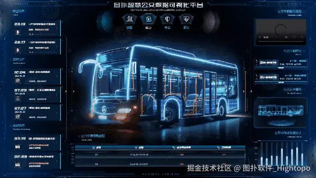 利用图扑软件自研的 HT for Web 产品搭建的智慧公交数据可视化监控大屏,通过整合目标车辆,将多源、异构、海量数据进行时空校准,实现对公交车运行状态、乘客流量、路线优化等信息进行多维度综合实时监控。帮助交通管理部门实时监控并分析交通流量,动态优化公交路线规划, 有效缓解城市交通拥堵,为市民提供更便捷、舒适的出行体验。